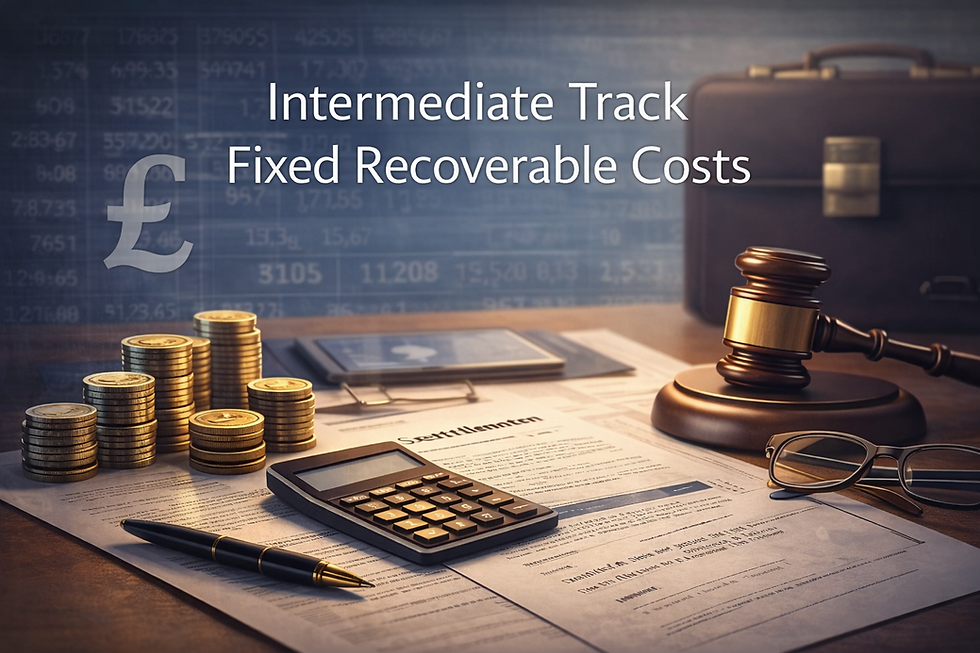 This page provides the Table 14 figures for Intermediate Track fixed recoverable costs under CPR 45.50. If you need worked examples or practical explanations, see our Intermediate Track Complexity Bands guide. If you need help with band allocation, see our Intermediate Track Fixed Recoverable Costs guide.